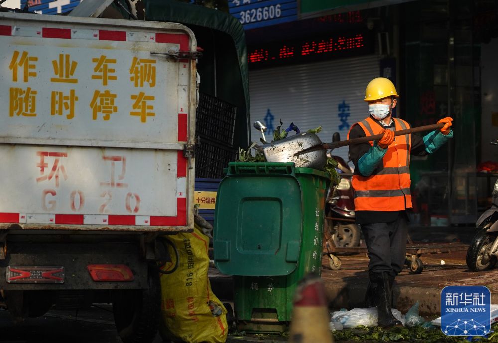 1月21日清晨,广东省清远市的环卫工人在进行道路保洁、垃圾清运工作。新华社发(邱炜民摄)