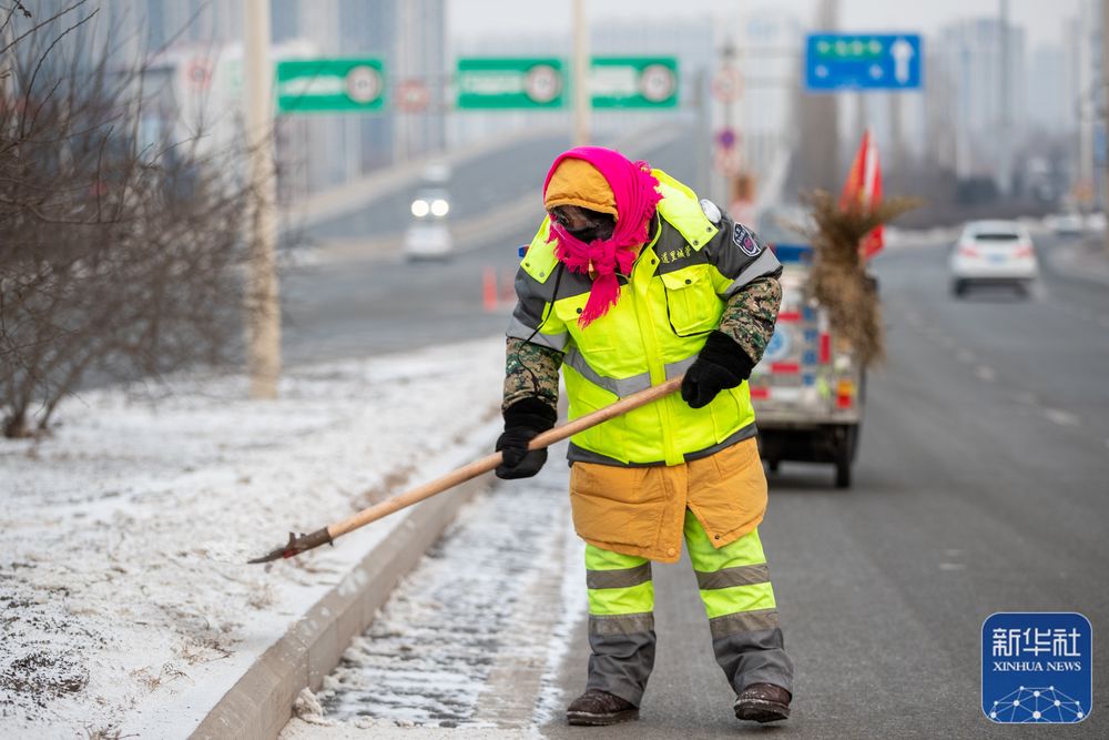 1月21日,在黑龙江省哈尔滨市道里区,环卫工李晓琴清扫街道。新华社记者 张涛 摄