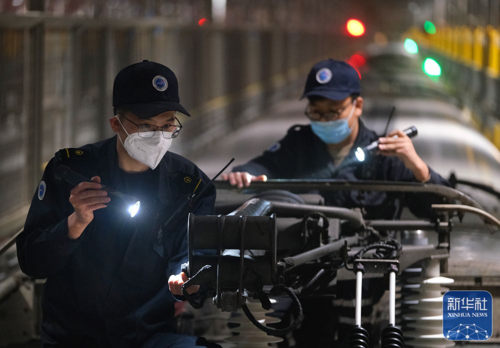 1月21日凌晨,机械师在天津动车客车段动车运用所检修库对进库的动车组列车高压供电系统设备进行检修。新华社发(杨宝森摄)
