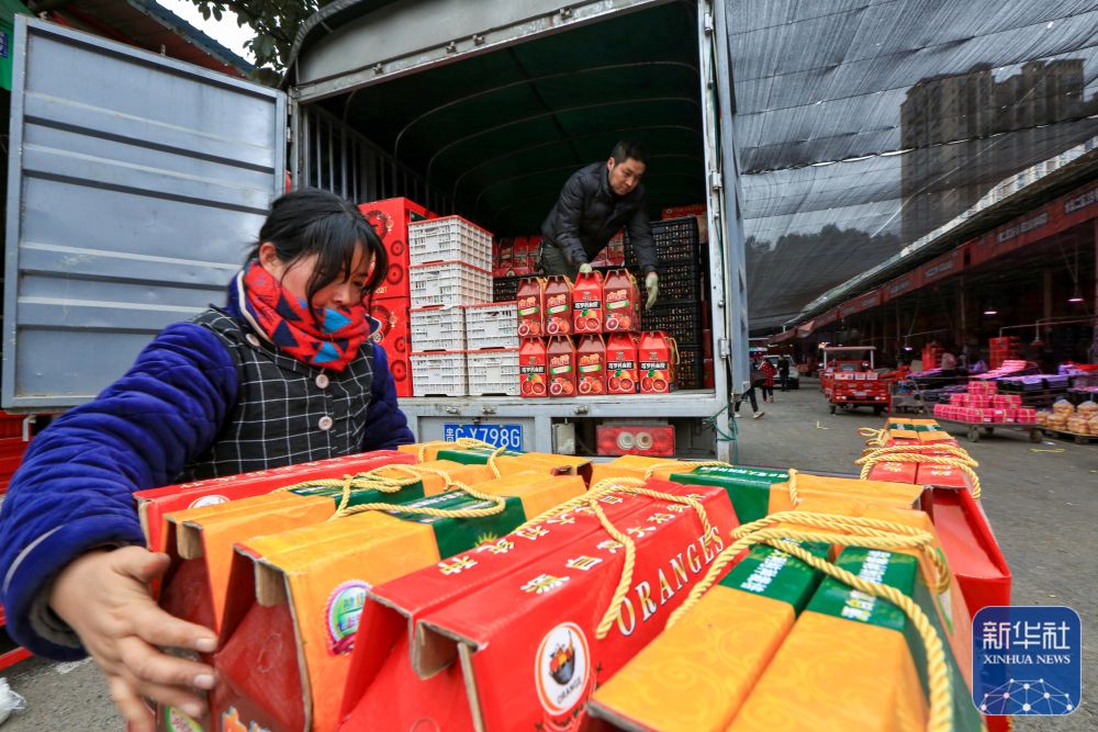 1月21日,工人在贵州省遵义市播州区龙坑街道农产品批发市场里搬运新鲜水果。新华社发(李仁军摄)