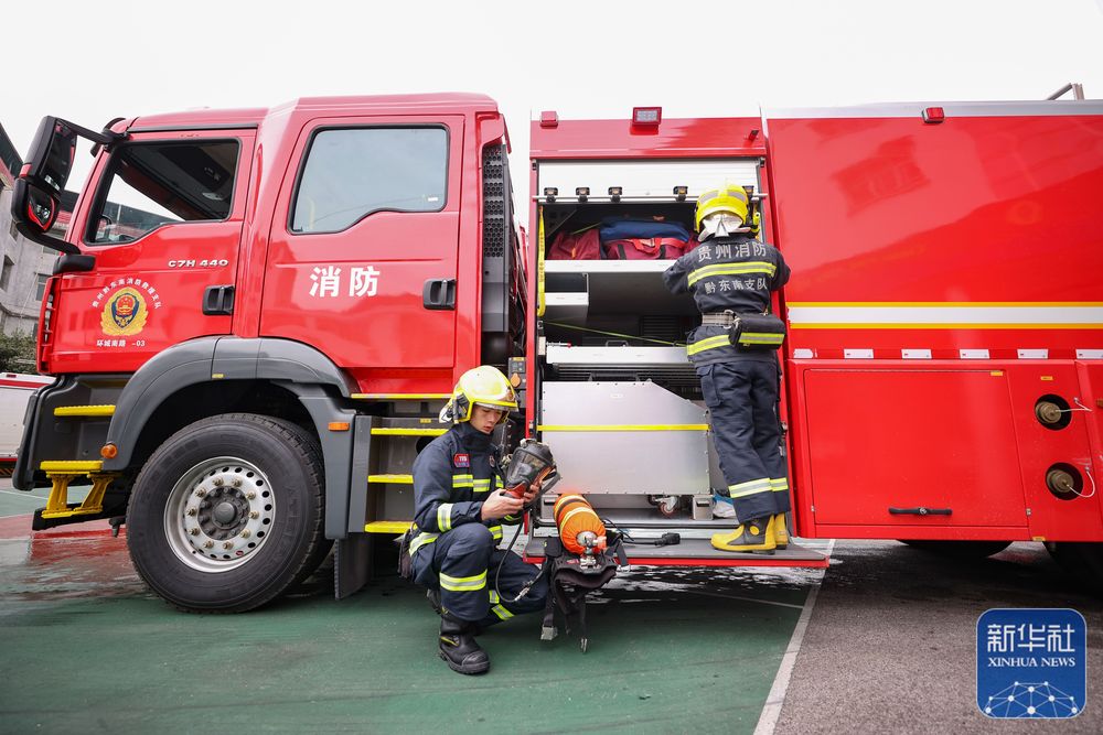 1月21日,贵州省黔东南苗族侗族自治州丹寨县消防救援大队队员在整理消防装备。新华社发(黄晓海摄)