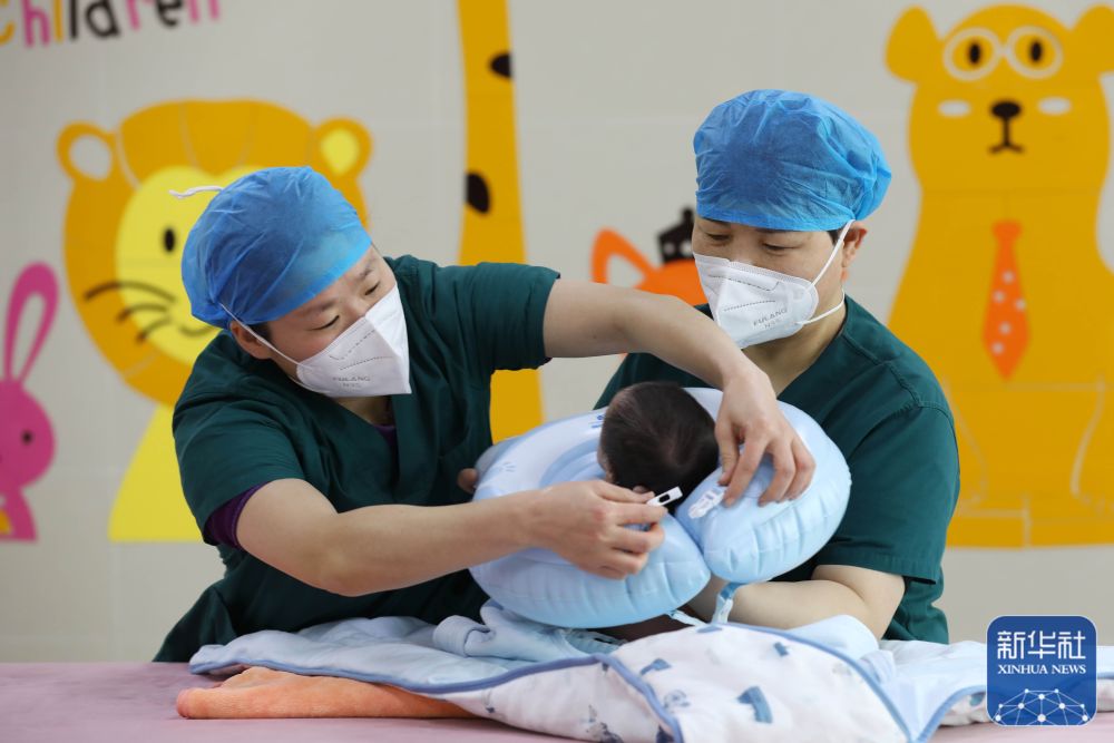 1月21日,在河南省宝丰县中医院新生儿洗浴中心,护士给新生儿做游泳前准备。新华社发(何五昌 摄)