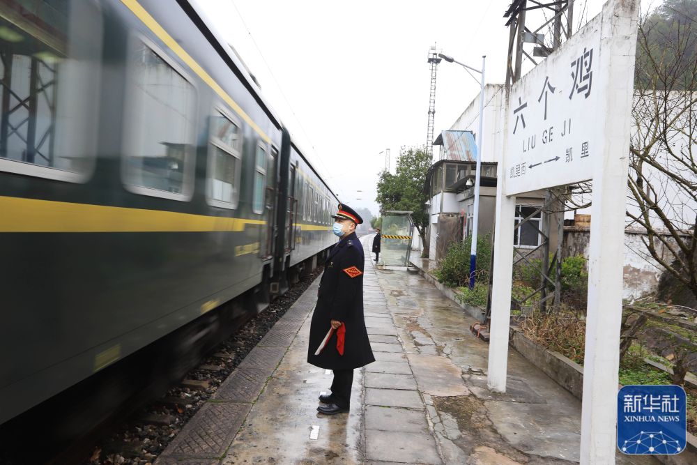 1月21日,在贵州六个鸡火车站,外勤值班员吴昌辉在站台接发旅客列车。新华社发(吴吉斌摄)