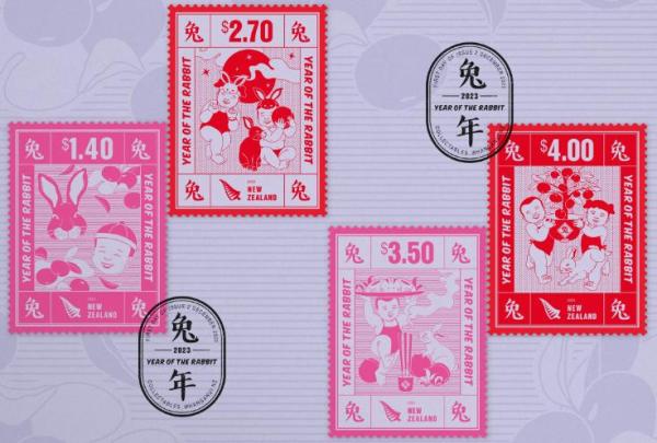 新西兰邮政发行的一套4枚兔年生肖邮票,延续了浓浓“年画风”,主题元素分别是兔子、月亮、灶神和吉祥果。