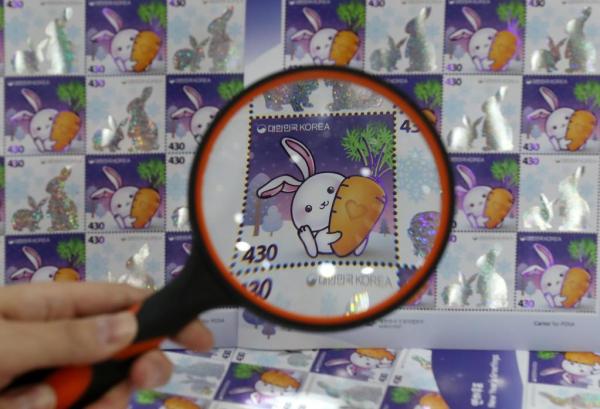韩国发行的兔年生肖邮票图案共有两种,一枚展现了雪地里一只白兔抱着胡萝卜的可爱模样,另一枚为雪天背景下双兔对望。