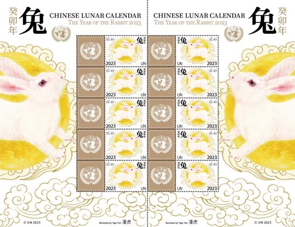 联合国邮政管理局1月20日在纽约发行中国农历癸卯兔年特别版邮票版张,庆祝中国农历新年的到来。版张由每枚面值1.40美元的10枚邮票组成,邮票左半部分为联合国会徽图案,右半部分为中国设计师潘虎创作的工笔画“月兔”图,背景是祥云围绕的金色月亮。