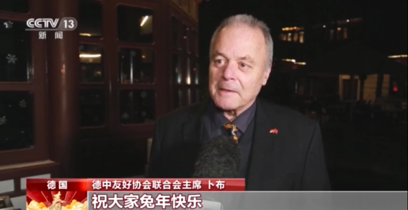 德中友好协会联合会主席 卜布:德国经济界热切期盼延续与深化双边原有的良好合作。祝愿所有中国朋友以及我们都拥有一个幸福的兔年,兔子寓意带来好运,用中文来说就是,祝大家兔年快乐。