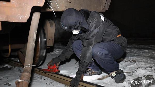 长春车务段长春东站连结员李阳在尾部车辆安放防溜铁鞋。受访者供图