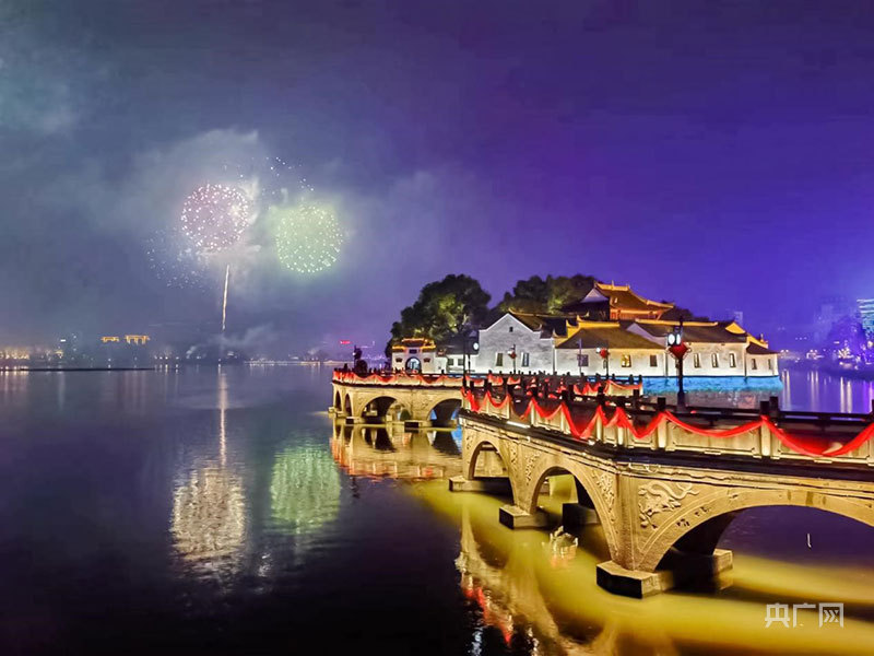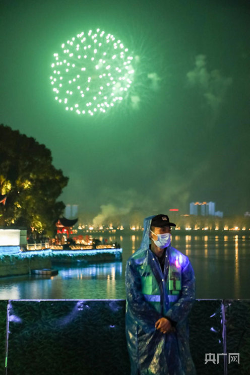 “砰砰砰!”“哇,好好看啊!”当天晚上8点整,一颗颗礼花弹腾空而起,在空中幻化出寿桃、松柏、瀑布等各种光彩夺目的造型,与浔阳的烟水亭、李公堤等景区交相辉映,将新春的浔阳之夜打扮得美轮美奂。