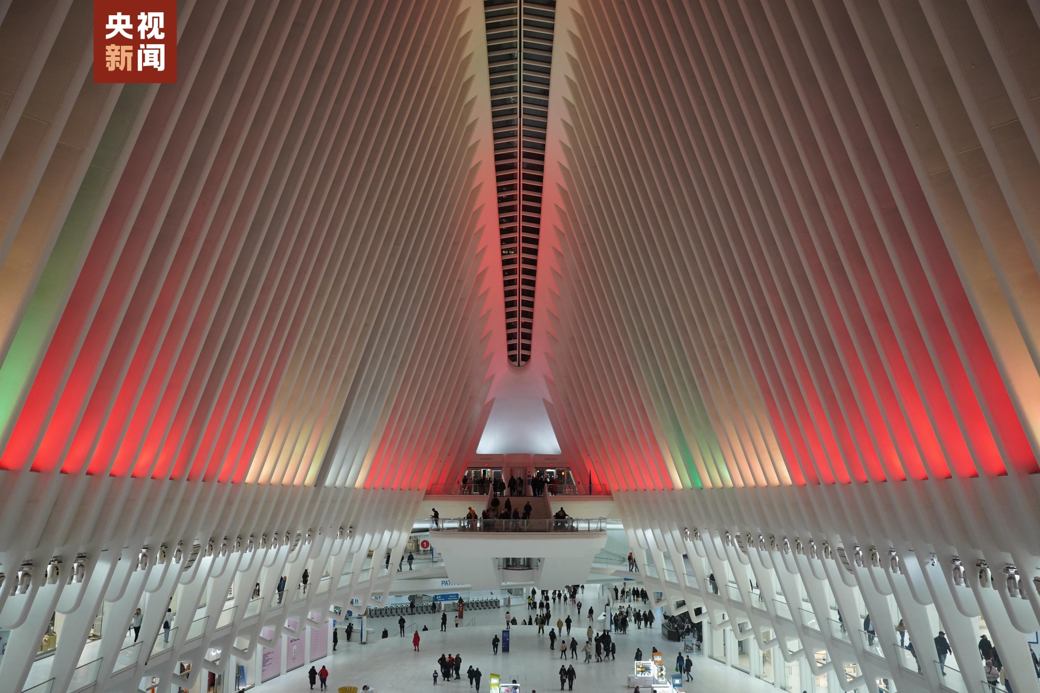 世贸中心车站内通过红黄绿三色投射在骨状屋顶结构上,呈现出喜庆之感。世贸中心一号楼除了楼顶天线被打亮成“中国红”外,底层外屏也反复播放兔年动画,不少游客驻足拍照。