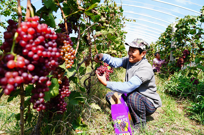 △在山东省惠民县胡集镇惠台葡萄专业合作社,村民在采摘葡萄(2022年9月24日摄)。