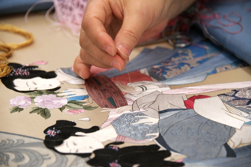 后来,程曼萍如愿留在刺绣车间,开始了逐梦生涯。两年以后,因为刺绣技艺扎实,还在学徒期的程曼萍被破格选入《清明上河图》绣制小组,参与绣制基础针法部分。“我不是有天赋的人,只能特别努力。”程曼萍说道。被选入绣制小组后,程曼萍给自己制定了“加练”计划,白天在厂里绣制《清明上河图》的基础针法,晚上回去加练复杂针法到深夜。