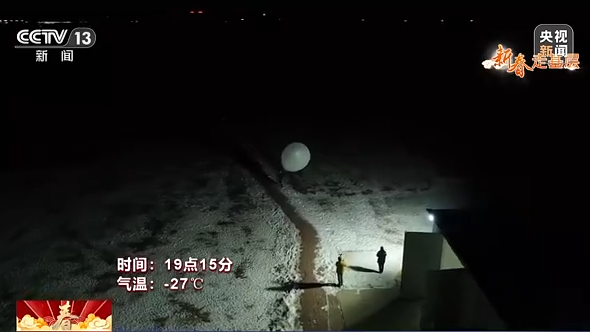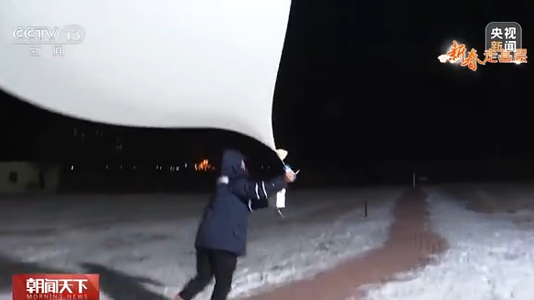 晚上7点15分,室外气温降至零下27摄氏度,气象观测员孟祥龙听到放球口令后,将带有传感器的氢气球放飞到空中。