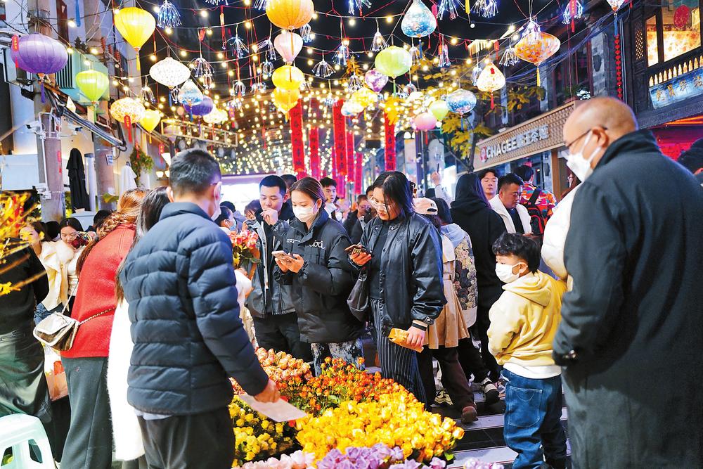 春节假期,昆明市南强街巷夜经济火爆。集市上人头攒动,璀璨灯火、大红灯笼烘托出喜庆的新春氛围。琳琅满目的小吃、精彩纷呈的演出,吸引全国各地游客前来“打卡”。(云南日报 记者陈飞/摄)