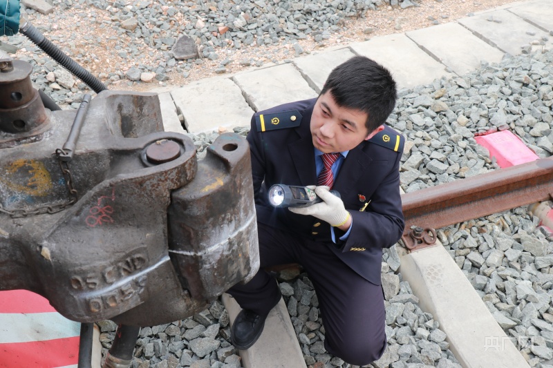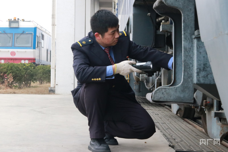 臧珂正在对热备机车车钩进行检查(央广网发 郑文博/摄)