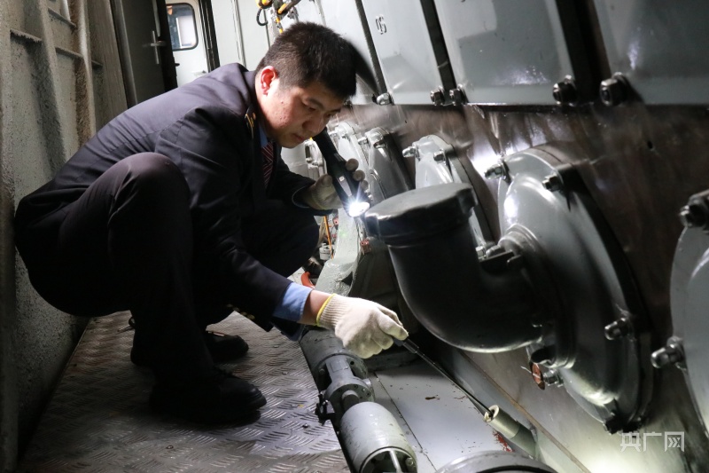 臧珂正在对热备机车机械间内部件进行检查(央广网发 张聪奕/摄)