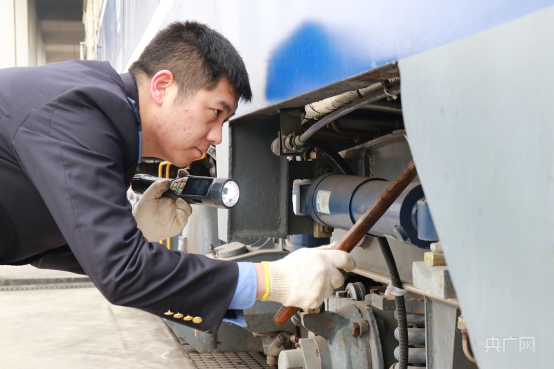 臧珂正在对热备机车走行部进行检查(央广网发 郑文博/摄)