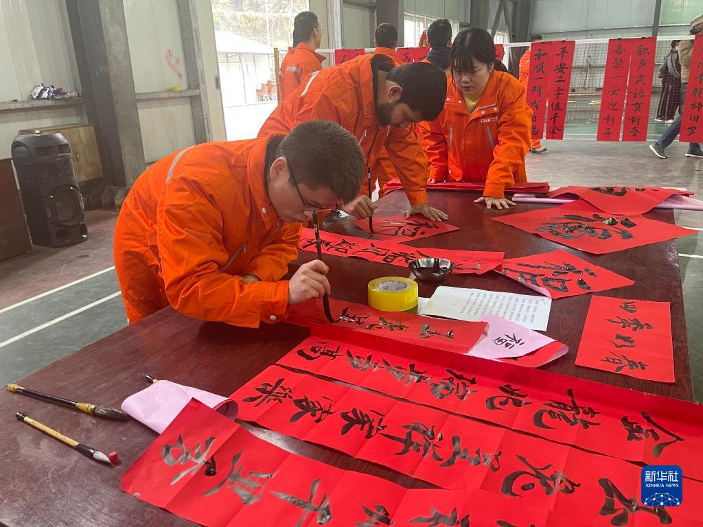 1月15日,苏吉吉纳里水电站项目工地迎新春活动现场,中巴员工一起用毛笔写春联。新华社发