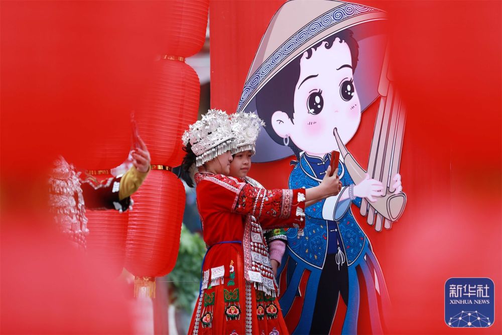 1月26日,游客在贵州省丹寨县万达小镇景区拍照游玩。 新华社发(肖伟 摄)