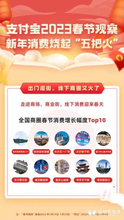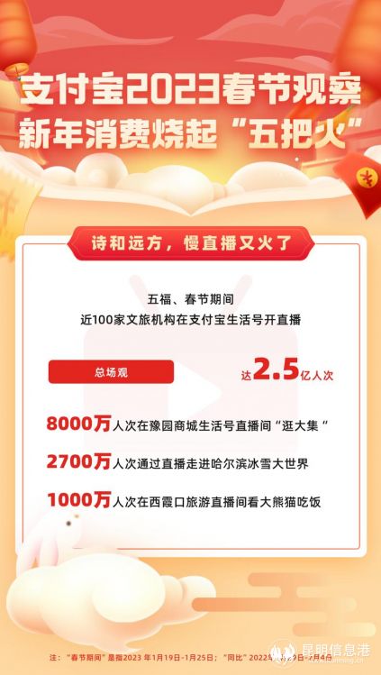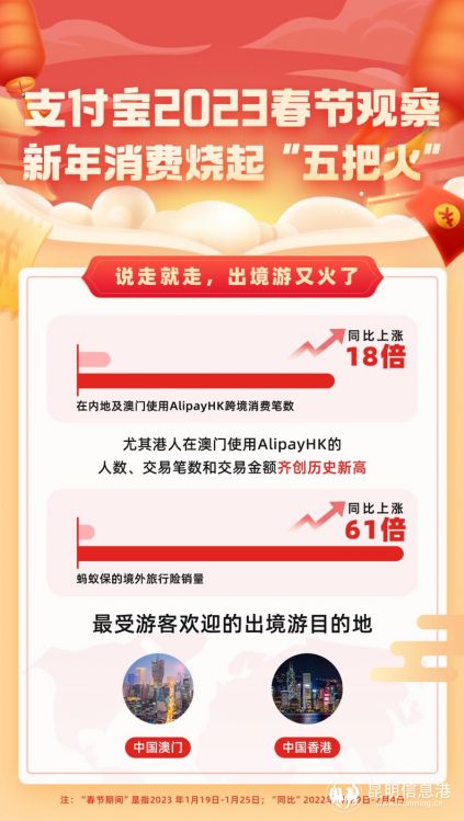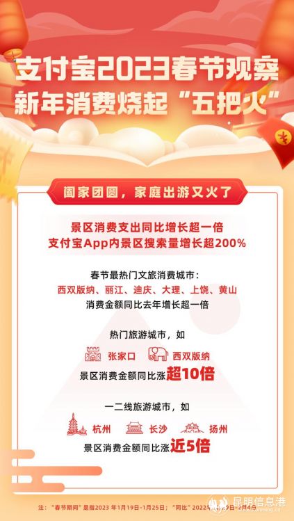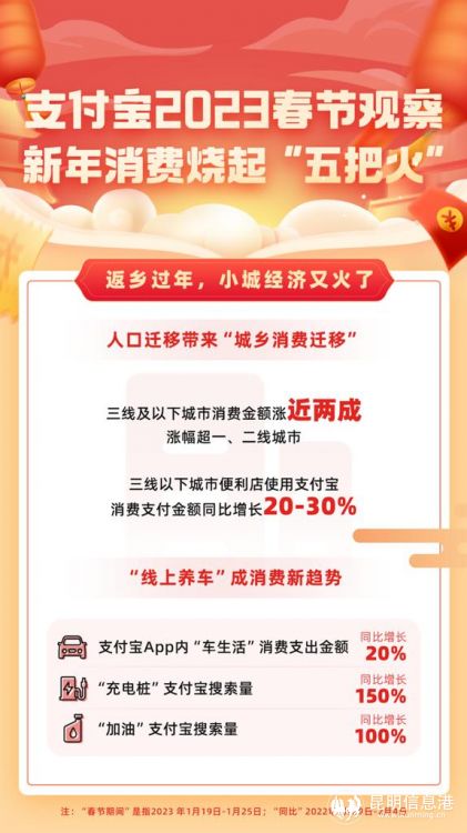 1月27日,支付宝发布2023年春节消费观察——新年消费烧起5把火,居民消费热情加速回归。