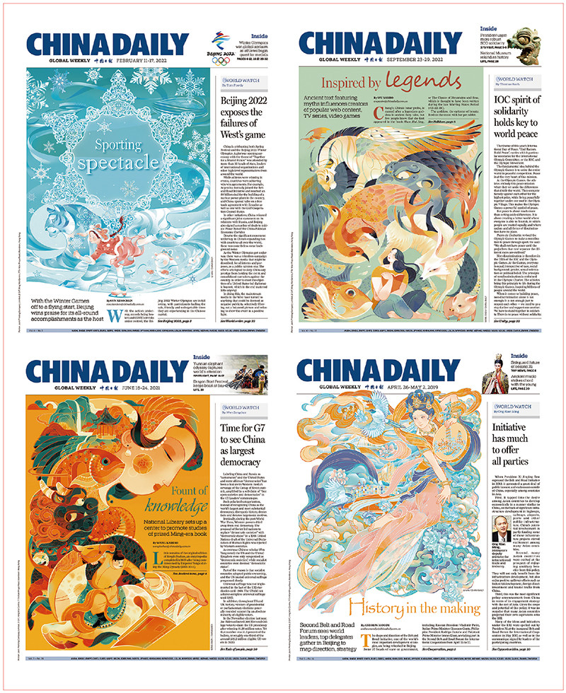 中国日报“画时代”工作室创作饱含中国美学意蕴的插画,随《中国日报国际版》周末版全球发行。图为与北京冬奥会“雪花”元素、《山海经》、中国古籍、敦煌飞天相关的版面。中国日报社供图