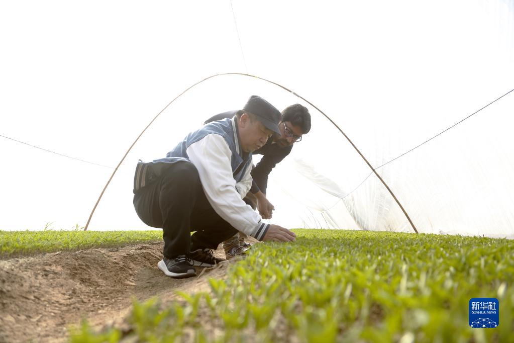 1月16日,在位于巴基斯坦旁遮普省木尔坦的中巴辣椒订单种植项目辣椒育苗大棚内,中国农业专家赵建华(右)带领巴基斯坦技术员萨贾德查看辣椒秧苗生长情况。新华社发(艾哈迈德·卡迈勒摄)