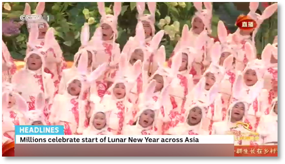 总台CGTN全平台共发布春晚相关报道3334条,全球阅读量超过4.79亿次;多语种主持人、主播发起的《兔子手势舞》创意新媒体传播活动,全球阅读量突破3.4亿。