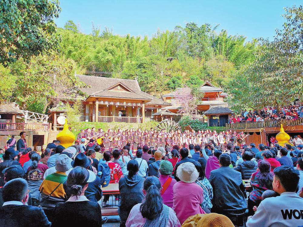 今年春节,澜沧拉祜族自治县酒井乡老达保村村民们时隔3年后再次回到乡村舞台,为观众奉上精彩的芦笙舞、摆舞、无伴奏合声演唱,慕名而来的八方游客跟着《快乐拉祜》一起尽情摇摆、欢唱。大年初三至初五,老达保生态实景演出观看游客近5000人次。澜沧老达保快乐拉祜演艺有限公司副董事长李娜倮看到台下座席满满,喜悦难掩:“没想到复演那么火,单场观众数量甚至是以前的几倍。我们将继续把拉祜文化唱出去、跳出去,把游客引进来、留下来。”