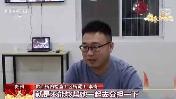 黔西桥路检查工区桥隧工 李奇:感觉很不是滋味,就是不能够帮她一起去分担一下。家里面过年,家里面都在吃好的,但是她在坐月子,只能吃一些清淡的。