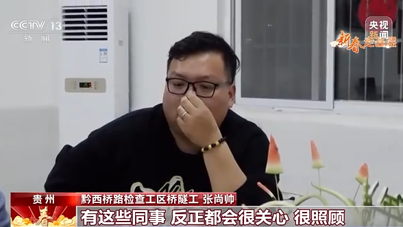 黔西桥路检查工区桥隧工 张尚帅:东北到西南是中国一条对角线,路途会很远,搞不好饮食和生活都不习惯,但是在这个大家庭里边,有这些同事,反正都会很关心,很照顾。我只想对家人说,我在贵州很好,你们也不要担心。