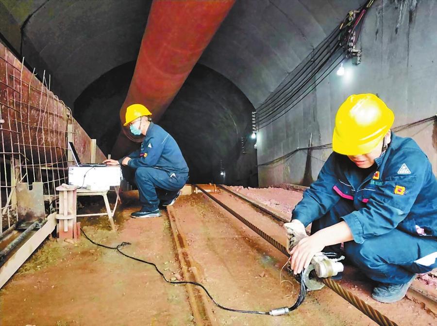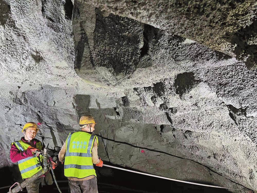 春节假期,滇中引水工程楚雄段6标凤凰山6号支洞工区加紧施工,建设者正在进行绞车轨道维修保养及隧洞内下游开挖作业。