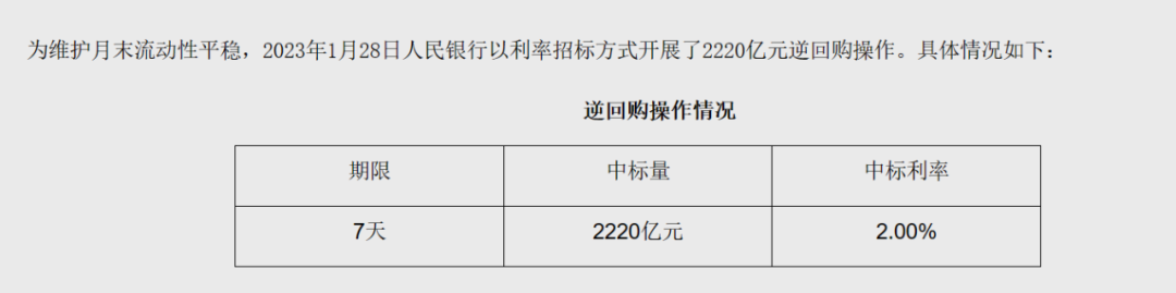 人民银行网站消息,为维护月末流动性平稳,2023年1月28日人民银行以利率招标方式开展了2220亿元7天期逆回购操作。由于当日有6980亿元逆回购到期,实现净回笼4760亿元。