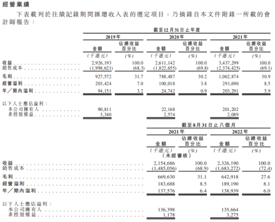 2019年至2021年及2022年1-8月,SML的收益分别约为29.26亿港元、26.11亿港元、34.37亿港元和23.26亿港元;期内溢利分别为9415.1万港元、2474.2万港元、2.03亿港元和1.39亿港元。