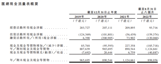 截至2019年末至2021年末及2022年8月31日,SML的经营活动所得现金净额分别为2.04亿港元、2.07亿港元、2.10亿港元和9371.6万港元。