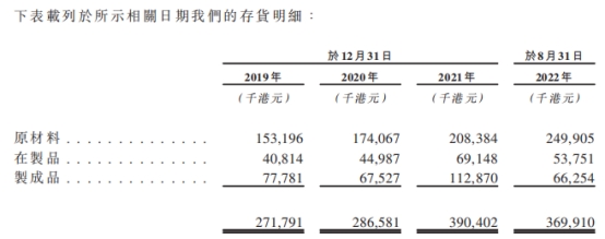 招股书显示,截至2019年、2020年及2021年12月31日以及2022年8月31日,SML的存货结余分别为271.8百万港元、286.6百万港元、390.4百万港元及369.9百万港元,占截至同日总资产的9.0%、9.0%、10.6%及10.9%。