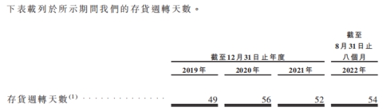 截至2019年、2020年及2021年12月31日止年度以及截至2022年8月31日止八个月,公司的存货周转天数分别为49天、56天、52天及54天。
