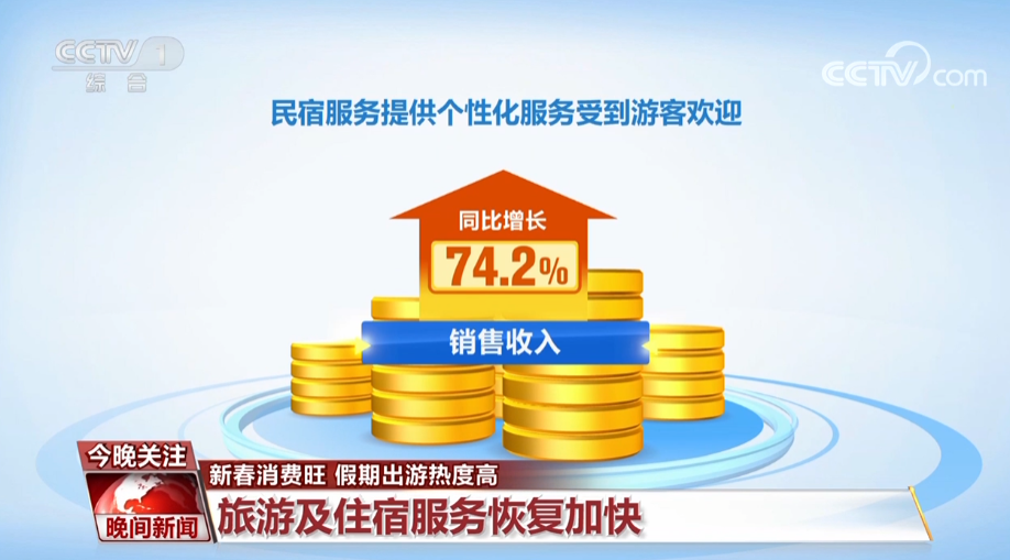 国家税务总局增值税发票数据显示,春节假期,旅行社及相关服务业销售收入同比增长1.3倍。旅游饭店、经济型连锁酒店销售收入同比分别增长16.4%、30.6%,民宿服务提供个性化服务受到游客欢迎,销售收入同比增长74.2%。