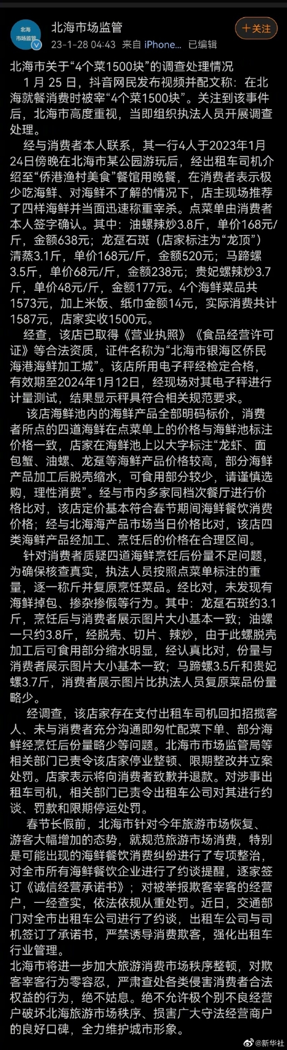 1月28日,广西北海市场监管部门通报关于“4个菜1500块”的调查处理情况。据通报,经调查,该店家存在支付出租车司机回扣招揽客人、未与消费者充分沟通即匆忙配菜下单、部分海鲜经烹饪后份量略少等问题。北海市市场监管局等相关部门已责令该店家停业整顿、限期整改并立案处罚。(记者:朱丽莉 陈露缘)