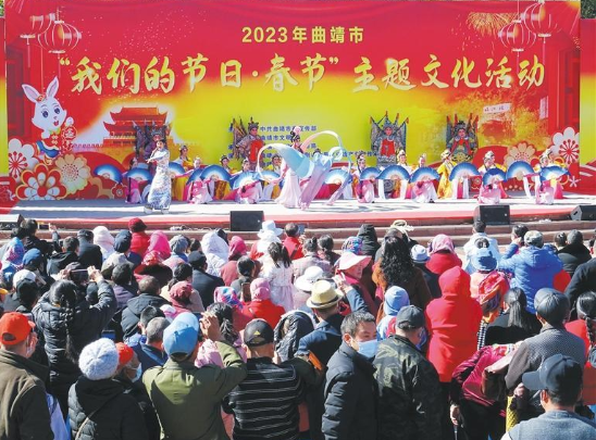 1月22日至27日,由曲靖市文化和旅游局主办的“我们的节日·春节”主题文化活动在珠江源广场举行,每天下午2:30演出一场文艺节目,演出的节目有舞蹈、独唱、小品、滇剧、花灯剧等,还有小戏专场、音乐会专场,极大地丰富了春节期间市民的精神文化生活,营造了喜庆欢乐、幸福团圆、文明祥和的节日氛围。活动期间出动演职人员360余人次,线上线下观众3万余人次。图为1月22日下午的演出现场。