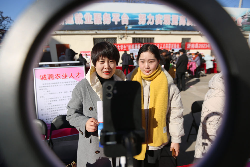 1月29日,在山东省临沂市沂南县举行的2023年“春风行动”暨“就业援助月”现场招聘会上,一家用人企业通过线上、线下相结合的方式介绍招聘岗位信息。新华社发(王彦冰 摄)