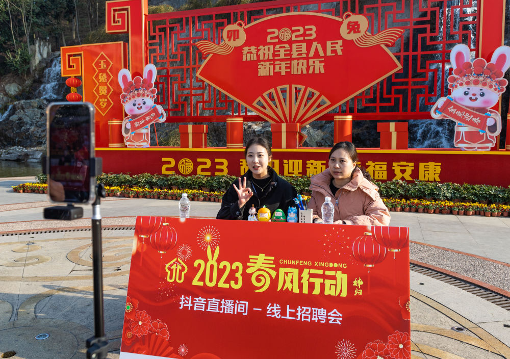 1月29日,用人单位在湖北省宜昌市秭归县的新春人才招聘会上进行直播,线上介绍岗位信息。新华社发(郑家裕 摄)
