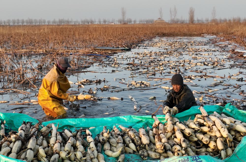 在新河县新河镇白穴口村莲藕种植基地,农民冒着严寒采挖莲藕。新华社记者杨世尧 摄