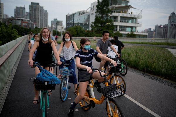 2022年6月26日,希瑟·凯(前排左一)与女儿和朋友骑共享单车游览上海。(路透社)
