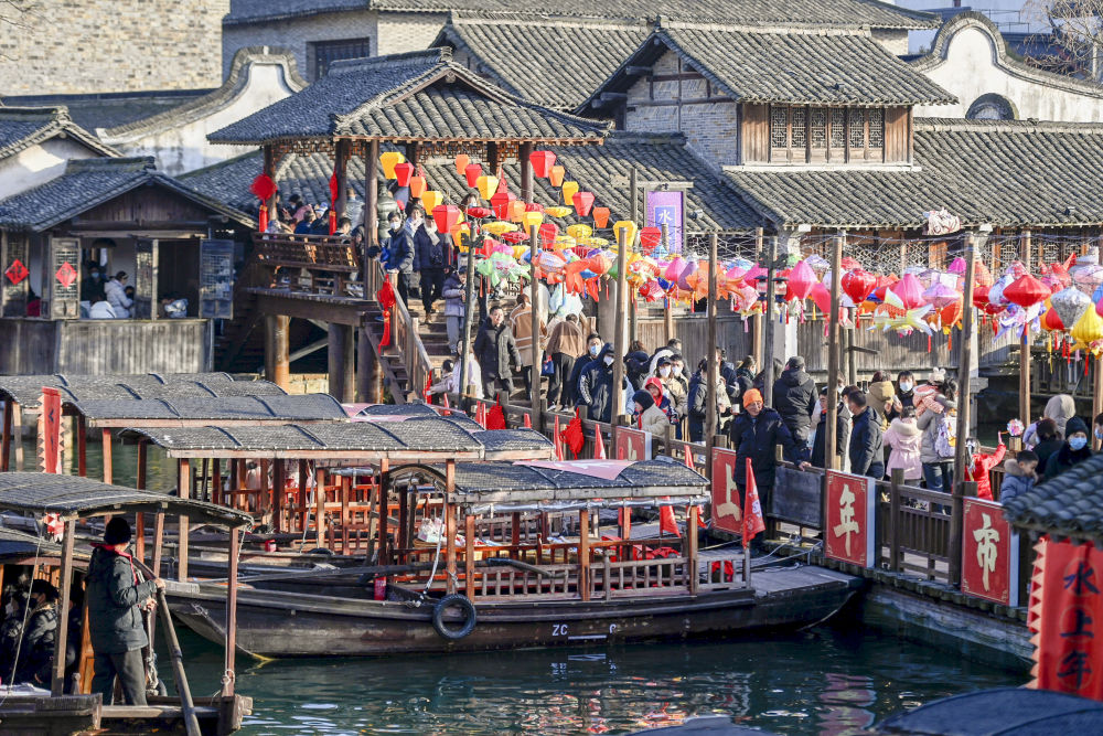 游客在浙江省桐乡市乌镇景区逛“水上年市”(1月25日摄)。新华社记者 黄宗治 摄