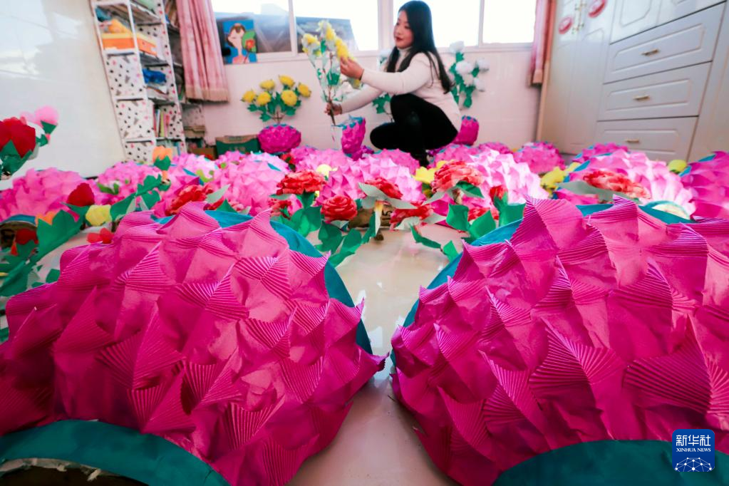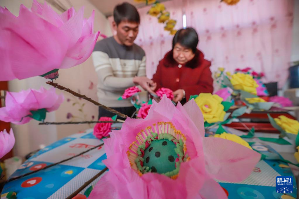 1月28日,迁西县洒河桥镇的民间艺人在赶制元宵节演出的跑花灯。
