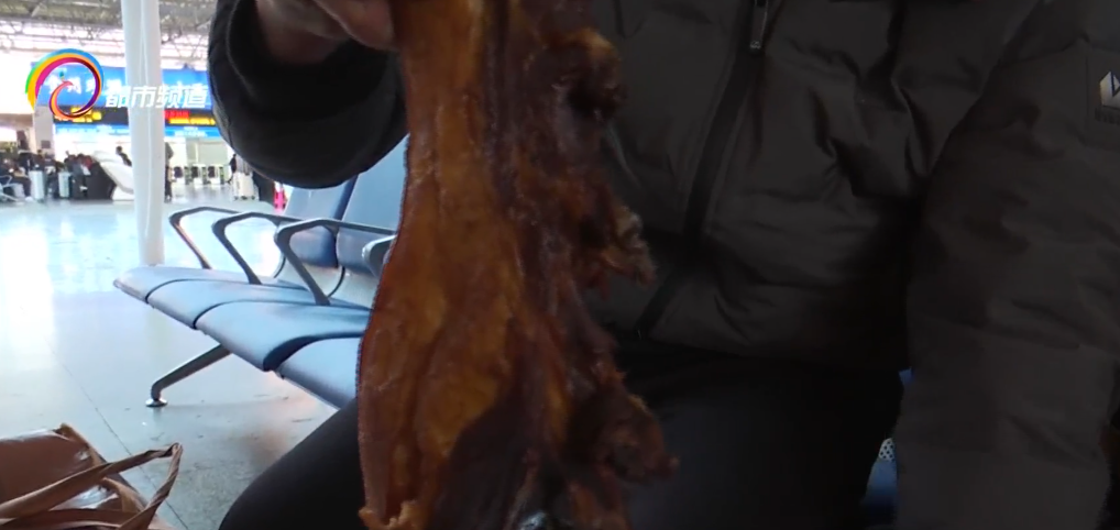 湖南旅客 肖师傅:“自己烤的腊肉,我们那里喜欢吃这个。”