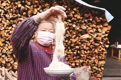 宗祠大院的后面,有一项“甜蜜的手工艺”——市级非物质文化遗产:手工麦芽糖,曾被中央电视台报道多次。百闻不如一见,百见不如一尝,很多游客慕名而来。走进巷道,就嗅到一股特别的糖香味,缥缥缈缈若有若无。李江欣把我们引到市级非遗传承人赵云满的家中。她和小孙子正在扯白糖,在盛满豌豆面的簸箕中,将膏状的糖稀扭成“8”字状,然后慢慢拉伸,反复操作上百遍,直至拉成丝状的龙须糖。赵云满介绍说,手工麦芽糖又被称为扯白糖,以糯米淀粉为原料,麦芽为辅料,经手工加工制作而成的糖源无蔗糖,纯手工制作,她家世代传承,现在已经有了第四代传承人。她家做麦芽糖用料讲究,严把每一道工序关,所以制作出来的白糖口感纯正,软糯香甜。不一会儿,赵云满和小孙子便把刚扯好的麦芽糖拿给我们品尝,入口即化,香甜入喉,这是传承的味道,更是奋斗换来的幸福味道。
