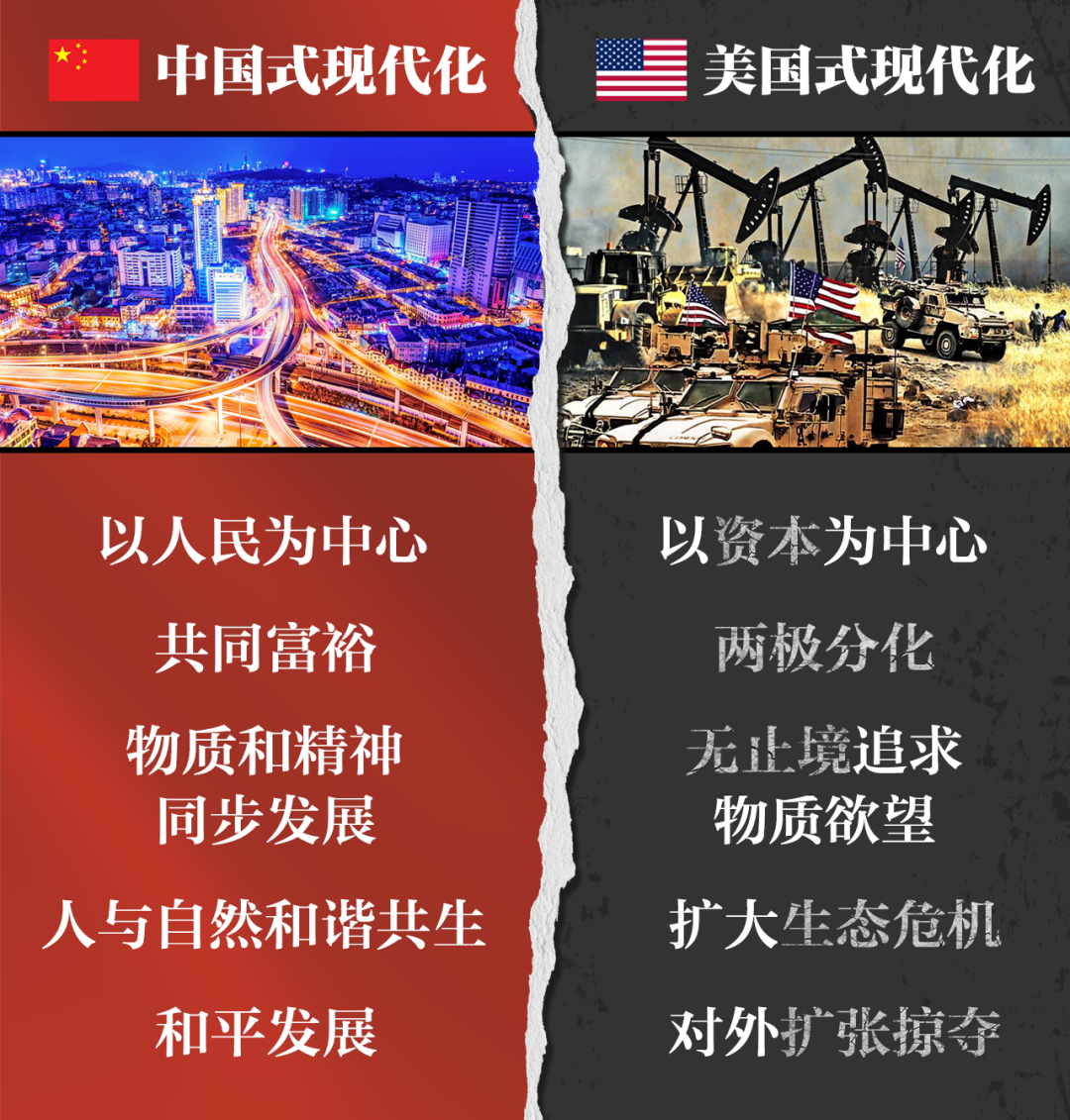 以美国为代表的西方现代化,走的是以资本为中心的现代化道路,不断对外扩张掠夺,最终导致世界财富积累和贫穷落后的分化对立加剧。