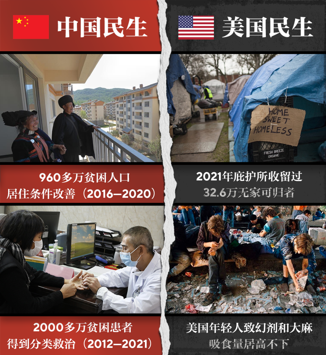 美国众多民众吸毒成瘾,无家可归,流落街头,种族主义、社会不公现象日益严重。