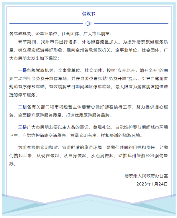 德宏州芒市各单位也主动向社会免费开放停车场,并在显著位置张贴“免费开放”提示,最大限度地缓解节日期间城区停车难题,为游客提供便捷的停车服务。
